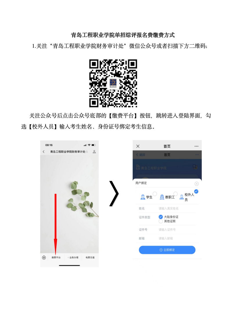 已完成单独招生和综合评价招生志愿填报并报考青岛工程职业学院(学院代码14666)的考生,请关注“青岛工程职业学院财务审计处”微信公众号,缴纳报名考试费80元。具体操作步骤如下